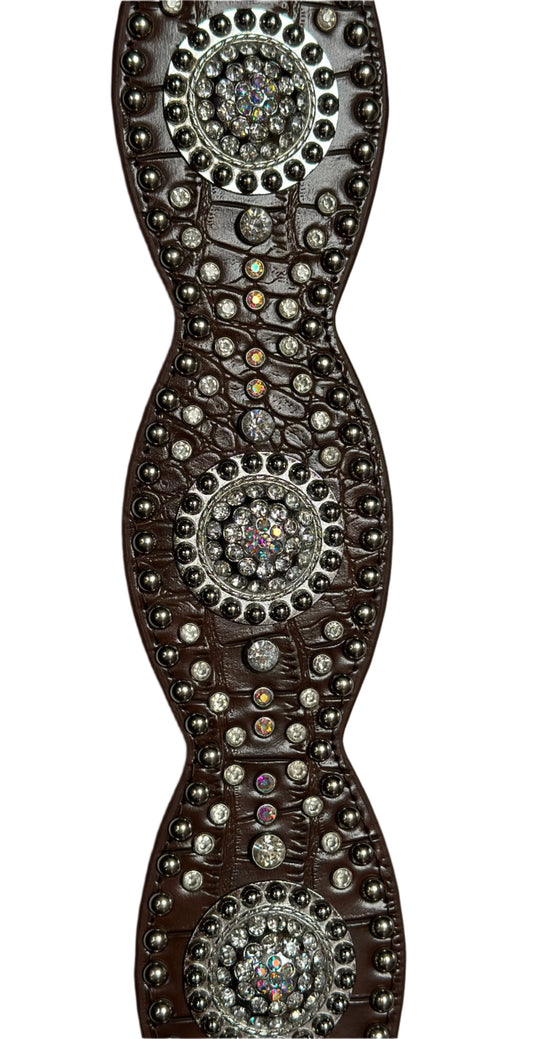 Nocona Belt Brown Leather with Alligator Print with Silver Conchos Adorned with Rhinestones