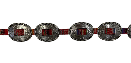 Nocona Belt - Thin Colorful Fabric Belt Woven Thru Silver Conchos
