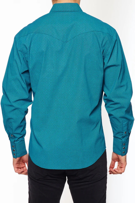 Rodeo Clothing Co. Men's Long Sleeve Western Pearl Snap Turquoise & Black Print Shirt