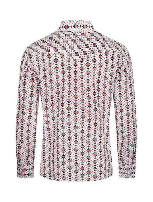 Rodeo Clothing Men's Long Sleeve Shirt - White with Black & Coral Aztec Print