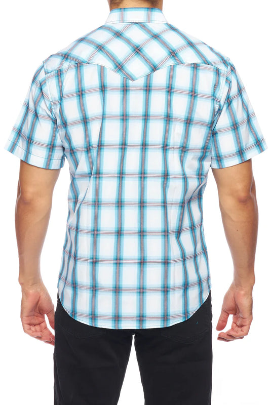 Rodeo Clothing Men's Short Sleeve Shirt - Turquoise, Red & White Plaid