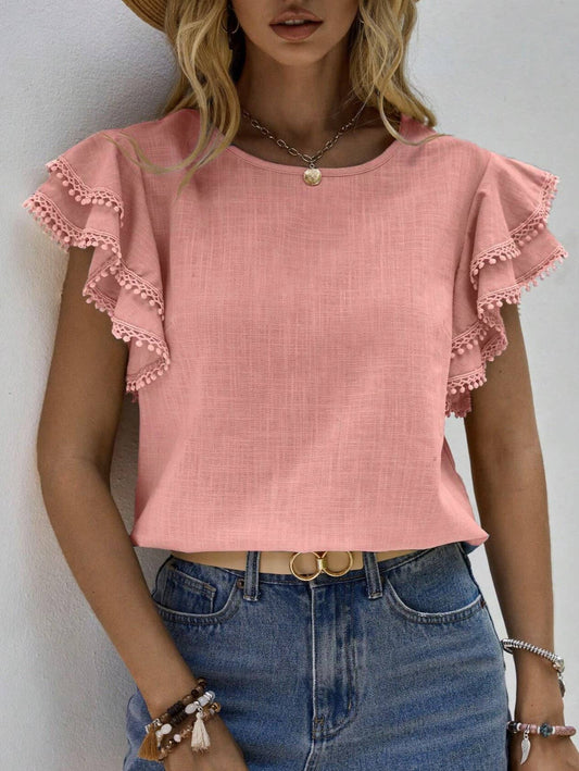 Rosa Clothing - Loose Lace Ruffle Short-Sleeved Top in Pink