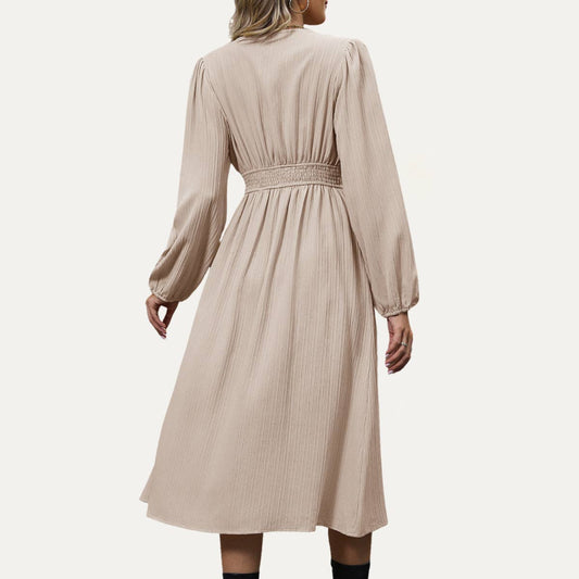The Moment Collection - Memorable Beige Textured Button-Front Long Sleeve Midi Dress