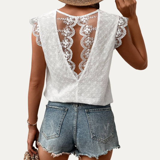The Moment Collection - Delicate White Pointelle Open-Back V-Neck Lace Top White