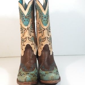 Tony Lama Women's Embroidered Cowboy Boots in Brown, Tan & Teal with Snip Toe