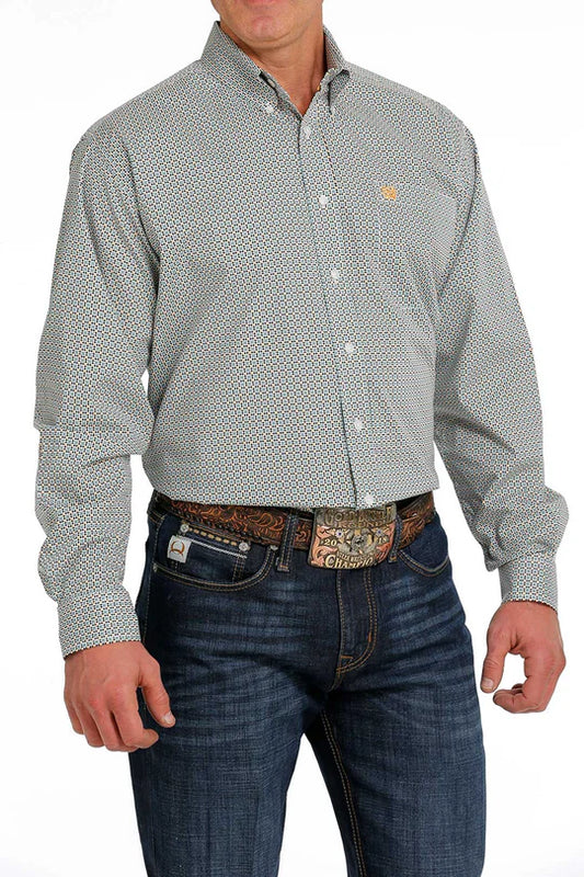 Cinch Men's Long Sleeve Shirt - Geometric Print Light Blue & White