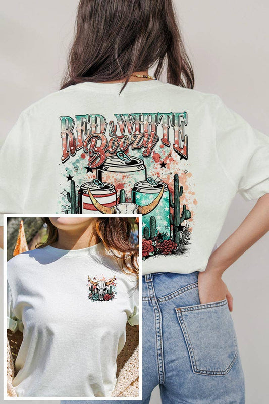 Colorbear Women's T-Shirt - Red White Boozy Bull Skull Graphic on Back
