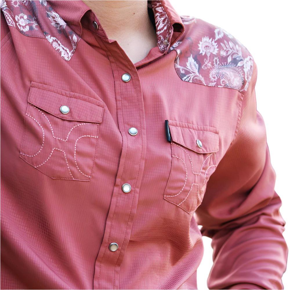 Hooey "Sol" Ladies Marsala with Floral Pattern Detailing Long Sleeve Pearl Snap Shirt