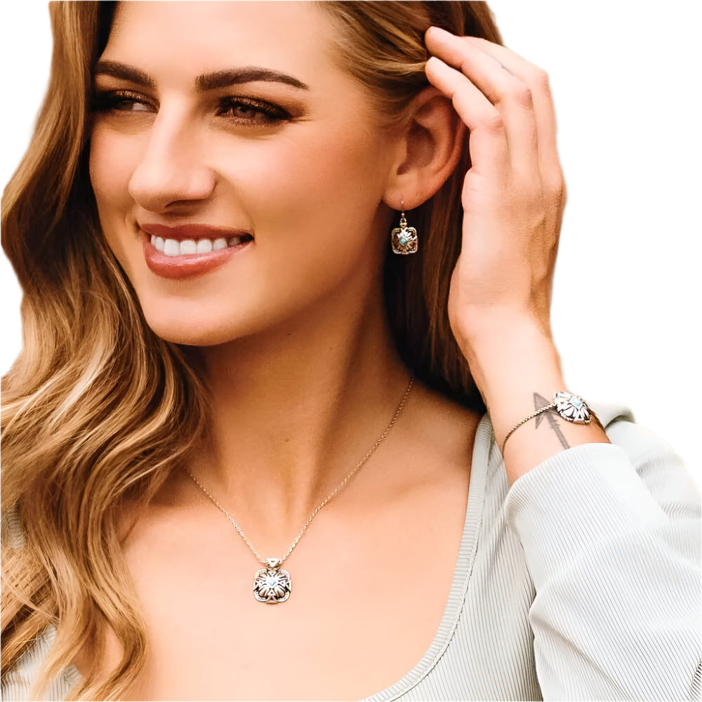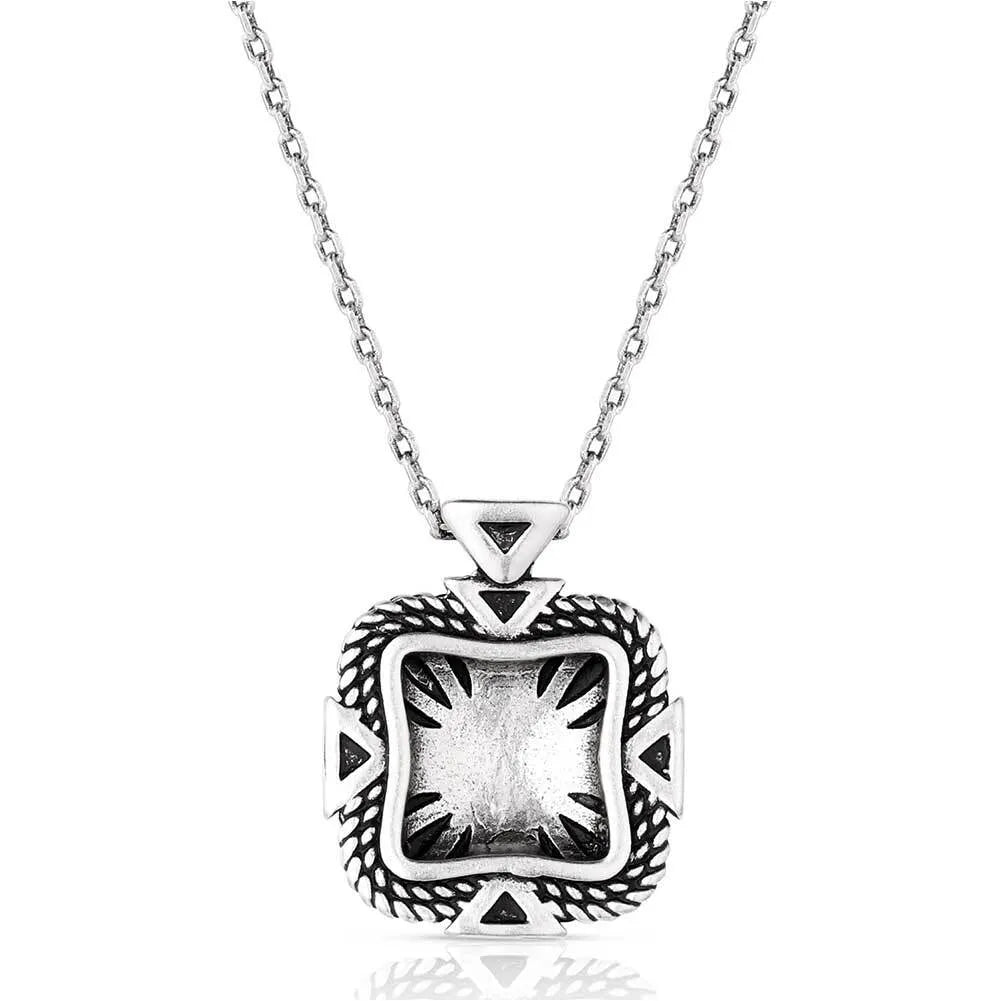 The Desert Sage Turquoise Necklace is an accessory that will elevate any outfit. The silver tone pendant is in a square shape with a twisted rope border. Dark black paint contrasts with the bright silver finish bringing out the details in the etched design. A square turquoise stone sits in the center giving a hint of color. This necklace has a 19 inch adjustable chain.
