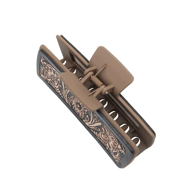 You'll love this great hair clip, which offers great form and function. The comb holds securely, with a comfort-wave design (no sharp teeth!). It's in a delightful sandstone color, and you have a wonderful set of choices for a unique and decorative accent: • Hand-Tooled Leather