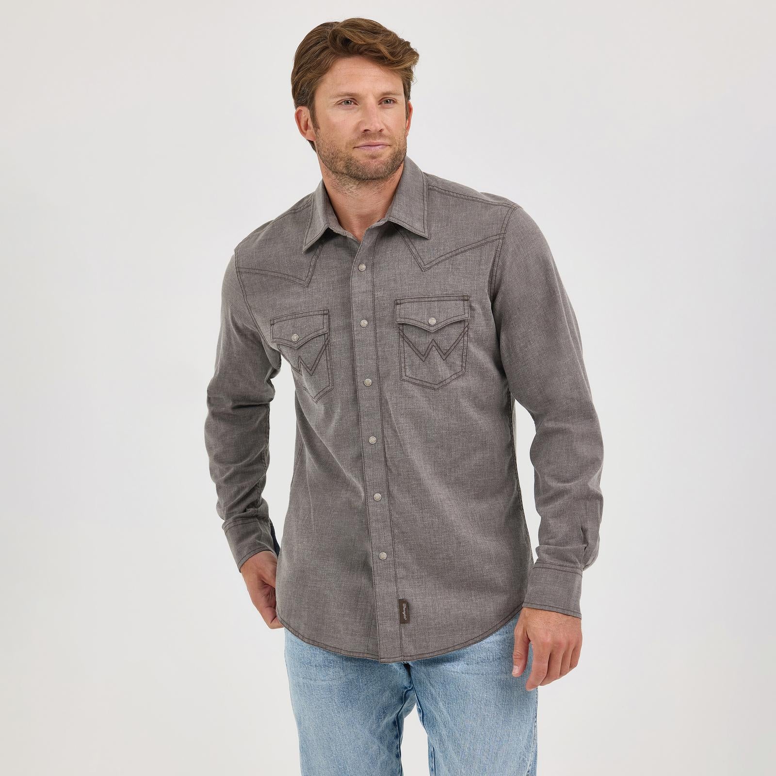 Embrace classic Western style with the Wrangler Men's Long Sleeve Retro Premium Modern Fit Brown Shirt. Crafted for a comfortable modern fit, this shirt combines timeless design with durable fabric, perfect for both work and casual wear. Its rich brown color and retro details make it a versatile addition to your wardrobe, offering rugged style that lasts from dawn to dusk.