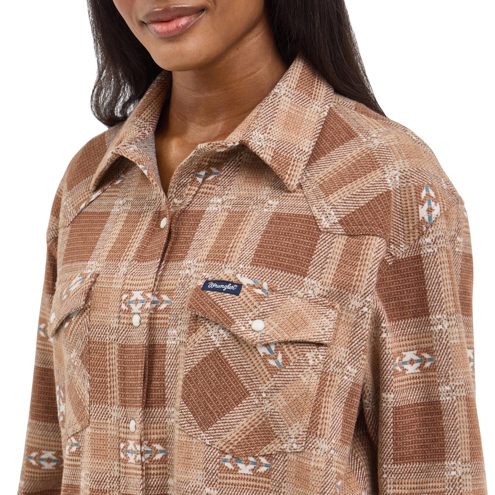 On cold days, kick back in total comfort wearing our Women's Wrangler Retro® Boyfriend Shirt Jacket. With the style of a favorite shirt and the lightweight warmth of a favorite jacket, this shacket gives you the best of both worlds. It’s crafted from a cozy fabric blend, with a boyfriend fit offering extra room and the lived-in feel you love. It also features single-point yokes from front to back and chest flap pockets as well as pearl snaps and Western-inspired motifs woven in for a truly authentic cowgirl statement piece that’s perfect for layering.